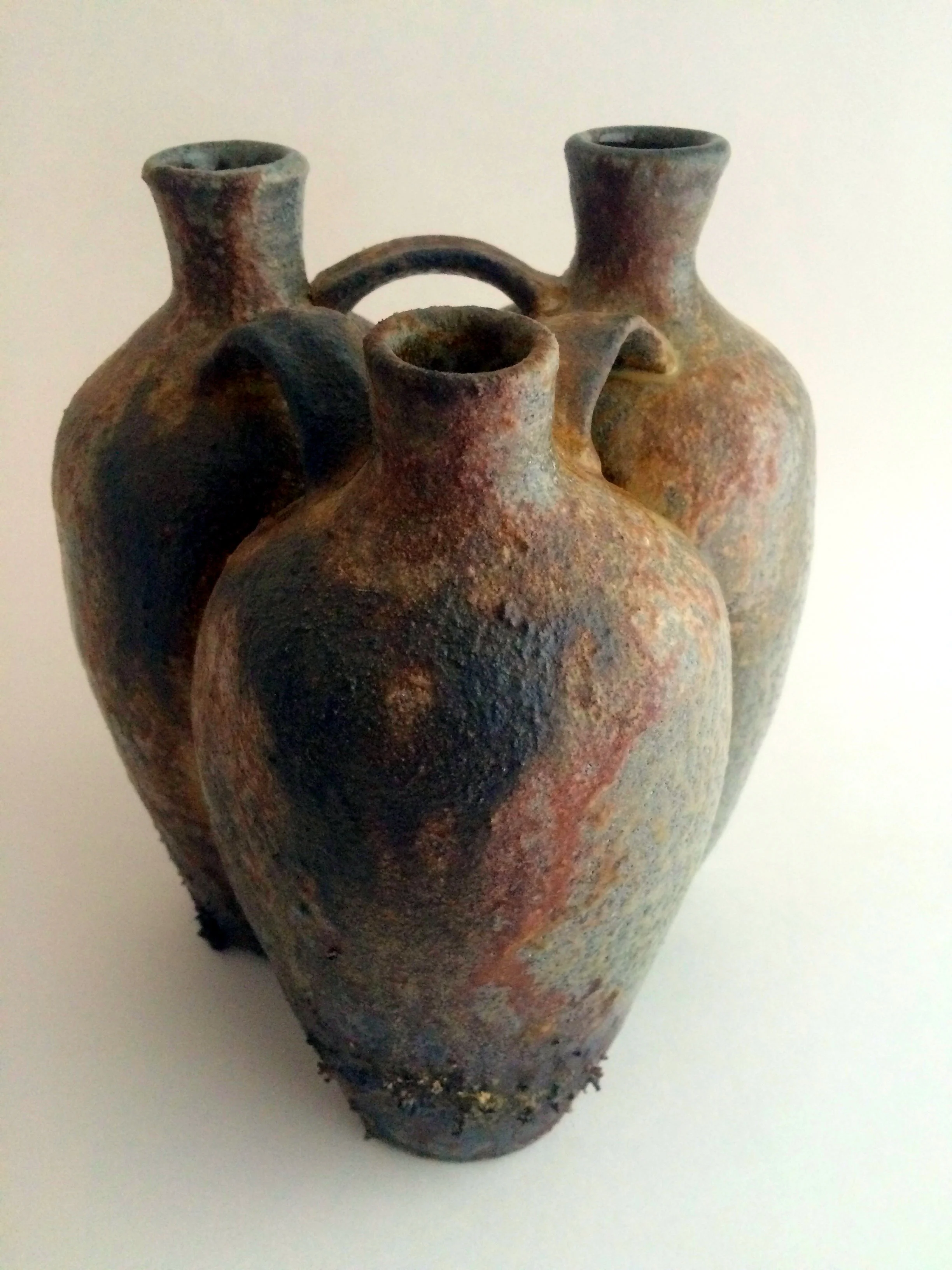 Wood-fired conjoined jug with heavy ash deposit from 2015
